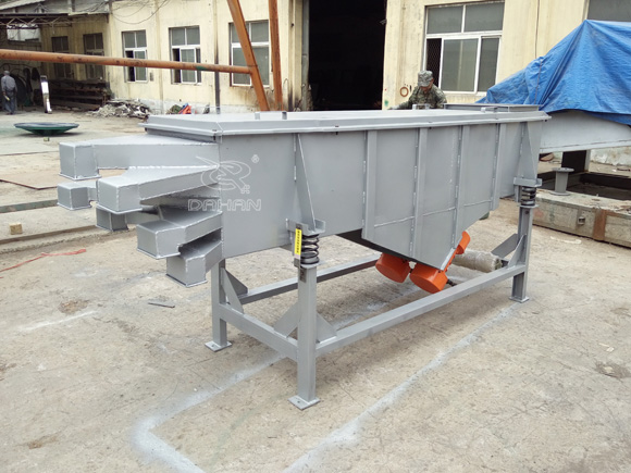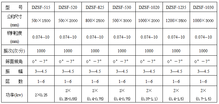 DZSF系列直線振動篩為雙振動電機驅動。當兩臺振動電機做同步、反向旋轉時,其偏心塊所產生的激振力在平行于電機軸線的方向相互抵消,在垂直于電機軸的方向疊為一合力,因此篩機的運動軌跡為一直線。兩電機軸相對篩面在垂直方向有一傾角,在激振力和物料自重力的合力作用下,物料在篩面上被拋起跳躍或向前作直線運動,從而達到對物料進行篩選和分級的目的。適用于粒度在0.074—5mm,含水量小于7%,無粘性的各種干式粉狀或顆粒狀物料的篩分。大給料粒度不大于10mm.。多層