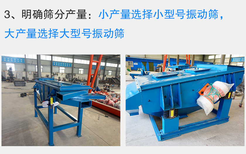 用戶對于振動篩類型已經有了充分的把握,那么接下來就是振動篩型號的選擇,而與型號相關的數據就是產量了,所以需要用戶告知篩分產量,從而確定振動篩型號。